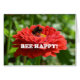 Niedliche Botschaft, "glücklich zu sein" mit einer geschäftigen Hummel, die Pollen aus einer hellen roten Blume sammelt.