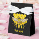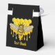 Honigbiene mit offenen Flügeln Ikone über Bienenstock und Honig fällt. Benutzerdefinierte Hintergrundfarbe. Benutzerdefinierter Text auf beiden Seiten.