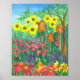 Ein hübscher und farbenfroher T - Shirt, der mit einem Aquarellgemälde aus einem Blumengarten mit drei Bienenblättern, hohen Sonnenblumen, Sitzbänken und anderen Blume im Hütte-Garten in kräftigen Farben dekoriert ist.