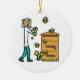 Beekeeping design shows beekeeper holding honeycomb and approaching the hive where the honey bees are flying around. For apiarists and beekeeping fans.