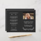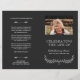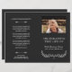 Elegantes Beerdigungsprogramm in gedämpftem Schwarz/Weiß, mit eleganten Schriftart und einem grünen Kranz. Fügen Sie ein Foto Ihrer Lieben zusammen mit ihrem Namen und Lebensjahren hinzu. Der Name wird in einem hübschen Skript geschrieben. Auf der Rückseite können Sie das Programm schreiben und schreiben. Falten Sie es selbst für ein praktisches Programm!