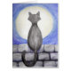 Original ist ein Aquarellstift, der auf Aquarellpapier einer schwarzen Katze zeichne, die auf einer Steinmauer sitzt und auf Vollmond starrt.