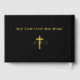 Das Design der Frontverkleidung zeigt einen schwarzen Hintergrund für die Reproduktion des Gemäldes "The Agony in the Garden" des Künstlers Frans Schwartz (1898). Text wird auf der rechten Seite angezeigt und enthält eine Überschrift und das Schließen in einem Klardruck mit dem Namen des Verstorbenen in einem eleganten Drehbuch in der Mitte. Auf der Rückseite wird eine Textzeile über dem Single eines Kreuzes mit den Buchstaben "IHS", dem katholischen Symbol für Christus, angezeigt. Der Bindungstext kann ebenfalls angepasst werden. Der gesamte Text ist in Folie. Der Kunde hat die Wahl zwischen Gold, Silber oder Rose-Gold.