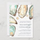 Planen Sie eine Fisch- oder Austerngruppe? Die Coastal Chic Party Einladung beinhaltet weiche Creme und Aqua Aqua Aqua Aquarell Auster und Perlen Illustrationen, mit Ihren Veranstaltungsdetails in klassischem Marineblau. Ideal für Feiern zum Thema Strand, Sommer oder Wassersport-Verlobung.