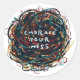 Ein chaotischer Wirbel aus bunten Kritzeln bildet ein kreisförmiges Muster. Das Zentrum zeigt die Worte "Embrace Your Mess" in klarer Blau.