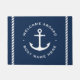 Die Türmatte ist mit einem weißen nautischen Anker und dem individuell anpassbaren Text "Welcome on board" versehen und Ihr Bootsname wird durch die Seilränder flankiert. Weißes Design auf dunkelblauem Hintergrund.