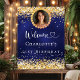 Ein Begrüßungspposter für eine mädchenhafte und glamouröse 21. Geburtstagsfeier (oder jedes Alter). Ein marineblau unebenfarbiger Hintergrund mit Imitaten goldenen Konfetti dekoriert. Personalisieren und fügen Sie einen Namen und Alter 21. Herzlich willkommen! Fügen Sie Ihr Foto in den goldenen Rahmen des Imitats.