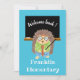 Eine niedliche digitale Einladung für Lehrer, ihre jungen Schüler von der Schule aus willkommen zu heißen. Es ist blau vorne und verfügt über einen niedlichen Igel-Lehrer vor einem Schachbrett. Die Worte auf dem Board lauten "Willkommen zurück!" . Passen Sie es mit dem Namen Ihrer Schule an. Der Rücken ist schwarz. Personalisieren Sie es mit Ihrem Haupttext (einschließlich Datum und Uhrzeit der Veranstaltung) , dem Namen des Lehrers und der Homeroomnummer . © ArianeC Illustrations-Alle Rechte vorbehalten