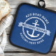 Pothalter mit weißem nautischen Anker, umgeben von einem Seilstreifen auf dunkelblauem Hintergrund. Über dem Anker befindet sich ein hellblaues Banner mit anpassbarem Text "welcome on board". Fügen Sie den Namen Ihres Bootes und den Hafen hinzu.