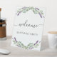 Ein Willkommensschild für ein Party. Weiß, mit Lavendel, Blumen und Eukalyptusgrün dekoriert. Personalisieren Sie Ihren Namen und fügen Sie ihn hinzu. Schwarze Buchstaben.