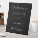 Ein schwarzer Hintergrund. Mit dem Text: Willkommen bei der Hochzeit von. und Willkommen" Personalisieren und fügen Sie Ihre Namen.