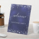 Ein Willkommensschild für ein Party. Ein marineblau blauer Hintergrund, die blaue Farbe ist ungleichmäßig. Dekoriert mit Imitaten silbernen Glitzer. Personalisieren Sie Ihren Namen und fügen Sie ihn hinzu. Weißer Text.