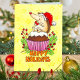 Diese Karte zeigt einen winzigen kleinen Igel, der eine Weihnachtsmannmütze trägt. Er sitzt glücklich auf einem Weihnachtskuchen und stöhnt auf der roten Beere, die oben war. Das Pflaumenpudding ist so groß wie ein Tortenkuchen und ist in eine rosa Papiertasse eingewickelt. Kleine Kiefernäste und Zweige mit roten Winterbeeren wurden als Dekoration umgegeben. Der Hintergrund ist gelb mit einem orangen, verblassten Sternmuster. Unter dem Kuchen steht geschrieben "Happy Holidays" in orangefarbenen Buchstaben.
