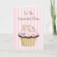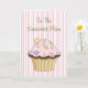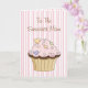 Sweet Mutter Tag Grußkarte, in rosa und weiß Streifen gemacht. Die Vorderseite der Karte ist mit einem skurrilen Schokoladenkuchen mit rosa Zuckerguss und Sprinklen geschmückt. Der Text des braunen Skripts lautet To the Sweetest Mama. Das Innere ist ähnlich wie das Äußere gestaltet und verfügt über einen weißen Textbereich mit braunem Text, der Mama grüßt. Der gesamte Text ist für Sie bereit, um für Ihre besondere Mutter zu personalisieren.