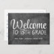 Chalkboard Design personalisierte Postkarte, um neue Schüler am ersten Schultag willkommen zu heißen. Im Text steht "Willkommen zur Xth-Klasse". Der Text unten beschreibt den Namen, das Thema und die Zimmernummer des Lehrers. Kursive Nachrichten an den Studierenden auf der Rückseite können ebenfalls angepasst werden. Es gibt Rabatte für Massengüter.