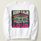 Ein Design im Retro-Stil, das "Behalt Calm" mit einer Boombox und dem Slogan "Play it Loud" verbindet. Mit kühlen Schriftart, Neonfarben und einer bedrückten Textur strahlt dieses lebendige Design Vintage Musiklimabedingungen aus.