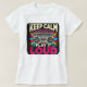 Ein Design im Retro-Stil, das "Behalt Calm" mit einer Boombox und dem Slogan "Play it Loud" verbindet. Mit kühlen Schriftart, Neonfarben und einer bedrückten Textur strahlt dieses lebendige Design Vintage Musiklimabedingungen aus.