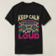 Ein Design im Retro-Stil, das "Behalt Calm" mit einer Boombox und dem Slogan "Play it Loud" verbindet. Mit kühlen Schriftart, Neonfarben und einer bedrückten Textur strahlt dieses lebendige Design Vintage Musiklimabedingungen aus.