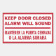 Behalt Türschließendes Warnschild in Englisch und Spanisch: BEHALTEN TÜR GESCHLOSSEN ALARM WIRD SOUND; MANTENER LA PUERTA CERRADA O LA ALARMA SONARA in fett roter Schrift auf weißem Hintergrund, um Aufmerksamkeit zu erhalten.