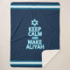 Blau-Weiß-Text mit dem Text "BEHALT CALM UND MAKE ALIYAH". Alija (ע ל י ה), was Aufstieg bedeutet, ist das hebräische Wort für die Einwanderung aus der Diaspora nach Israel. Aliyah gilt als "hinauf" in Richtung Jerusalem. Wofür warte du?