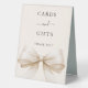 Beige, cremefarbene Unterlage, mit großem Bogen geschmückt. Text: Karten und Geschenke. Vielen Dank!