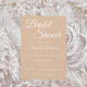 Einfache Stil, Brautduscheinladung mit einem trendigen, beigefarbenen Hintergrund, dem Namen und der Veranstaltungszeit der zukünftigen Braut, dem Ort, dem Kontakt usw., in weißer, stilisierter Schrift gedruckt. Personalisieren Sie Ihre Einladung, indem Sie Text durch eigene Brautparty-Informationen ersetzen. Wählen Sie Ihre Einladung Papier Stil und Quantität.