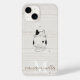 Haben Sie Liebe, Ihr iPhone-Cover so oft wie wir zu ändern? Karo dieses Beige Minimal Modern Initial Monogram Name iPhone 14 Case mit einer Doodle Yoga Katze auf einem hellen Holzhintergrund. Sie können es ganz einfach mit Ihrem eigenen Namen und Monogramm und sogar mit Ihrem eigenen Bild personalisieren.