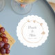 Set von 6 runden, absorbierenden Pulp-Board-Getränkekittern für Polterabende, Hochzeitsfeiern und sogar Proben-Dinners, die eine trendige, beige, schlichte Herzkranz-Design, Braut- und Bräutigam und das Hochzeitstermin in dunkelgrauer, stilisierter Schrift aufweisen. Bearbeiten und ersetzen Sie Namen und Datum mit Ihrem eigenen.