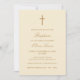 Beige Script Elegant Cream Taufen Einladung, bitte personalisieren Sie, wie gewünscht, mit der Online-Personalisierung Vorlage vor der Bestellung. Diese hübsche Einladung besticht durch das Kreuz und den stilvollen, eleganten Text in einem goldenen Beige-Farbton auf cremefarbenem Hintergrund.