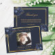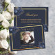 Ein einfaches und elegantes Beileid Dankeschön-Karte mit Foto. Ein dunkelblauer Hintergrund, ein goldener Rahmen mit Imitaten und blaue Blumen. Personalisieren Sie und fügen Sie Ihren Dankeschön Note.