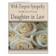 Mit tiefem Beileid auf den Verlust Ihrer Tochter in Law Express Ihr Beileid in Zeiten der Trauer durch das Senden einer personalisierten Karte an Ihre Familie und Freunde. Diese Karte ist auch in anderen Versionen, (familienspezifisch) und in einigen nicht-englischen Sprachen verfügbar. Inside Text Vorschlag: Beileid an Sie und Ihre Familie über den Verlust Ihrer Lieben. Unsere Gedanken sind mit Ihnen in dieser Zeit der Trauer. Mit tiefstem Beileid.