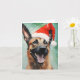 Farbenfrohe und fröhliche Weihnachtsgestaltung mit einem belgischen Malinois, der eine Weihnachtsmannmütze trägt.