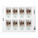 Weihnachtsgeschenk-Etikett mit einem Outdoorsfoto mit einem Team von 2 belgianischen Zugpferden, die einen Schlitten ziehen. Schneeflocken fallen sanft mit schneebedeckten Kiefern im Hintergrund herunter.
