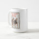 Eine Tasse mit dem Sprichwort: Schlittelglocken läuten. Entworfen mit einem Outdoorsfoto mit einem Team von 2 belgianischen Zugpferden, die einen Schlitten ziehen. Schneeflocken fallen sanft mit schneebedeckten Kiefern im Hintergrund herunter.