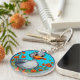 Caricature adorable canard avec un visage rond, grands yeux expressifs, et un sourire joyeux. Le canard a un corps gris clair avec du molleton blanc sur la poitrine, et son bec orange se distingue vibramment. Il se dresse au milieu d'un décor coloré de fleurs fleuries dans les tons orange et jaune, encadré d'un arrière - plan bleu vif. Toute la scène est encadrée d'une bordure circulaire qui renforce l'atmosphère ludique et animée de l'illustration.