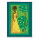 Belle fille afro-américaine en robe jaune formelle dans un jardin d'agrumes