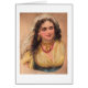 artwork vintage d'une belle femme tzigane aux cheveux foncés (ou mignon) habillée en style bohème avec boucles d'oreilles et collier en or orné ainsi qu'un collier aux perles rouges. La carte est vide à l'intérieur pour votre message manuscrit.