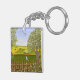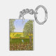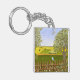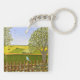 Un porte - clé avec une belle image d'une scène naturelle : Un oiseau assis sur une clôture patinée, des fleurs sauvages poussant autour de la clôture, un fermier sur un tracteur, travaillant sa terre, des arbres avec des feuilles, et des terres agricoles de différentes couleurs. Oeuvre originale de W.B.