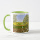 Une tasse avec une belle image d'une scène naturelle : Un oiseau assis sur une clôture patinée, des fleurs sauvages poussant autour de la clôture, un fermier sur un tracteur, travaillant sa terre, des arbres avec des feuilles, et des terres agricoles de différentes couleurs. L'arrière - plan et l'image peuvent être customisés. Le texte peut être ajouté. Oeuvre originale de W.B.
