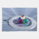 Ein 3D-Bild in Vue, voll von Reflexionen und Lichtern, die aus allen Richtungen leuchten. Fünf farbige Kugeln aus blau, rosa, türkis, orange und diamond gläsernen in einer Pyramide, die von einem durchscheinenden weißen Ring umgeben ist. Sie sitzen auf einem überwältigenden Hintergrund von blassblauen und weißen Strahlen, die sich unter den fünf Kristallkugeln aneinander reihen.