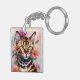 Le porte - clé est décoré de félins floraux d'un chat bengale aux yeux jaunes-verts entourés d'une variété de fleurs roses et violettes. Portrait d'aquarelle douce d'animal sauvage avec une esthétique féminine.