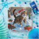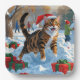 Eine herzliche Ferienillustrierung mit einer fröhlichen Katze, die im Schnee spielt, eine Weihnachtsmannmütze trägt und von bunten Geschenkboxen umgeben ist. Im Hintergrund bauen die Kinder neben einem schneebedeckten Weihnachtsbaum einen Schneemann und schaffen so ein fröhliches Winterwunderland. Ideal, um Feiertagssjubeln zu verbreiten und den Zauber von Weihnachten zu erfassen.