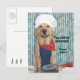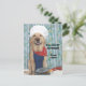 Ein gelbe Labrador in einer Schürze, Knochenbandana und Koch Hut mit einem Topf mit Hühnerbeinen. Sie können es für eine lustige Postkarte oder eine lustige, individuell anpassbare Einladung benutzen, um Freunde zu haben, wenn Sie kochen oder GRILLEN.