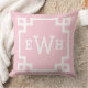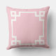 Das stilvolle und moderne Kissendesign mit quadratischem Akzent zeichnet sich durch ein griechisches geometrisches Rahmendesign und ein personalisiertes Monogramm aus. Helle, rosa und weiße Farben. Die Hintergrundfarbe kann geändert werden.