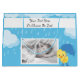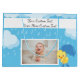 Der Hintergrund ist ein hübscher, hellblauer Himmel mit puffigen, weißen Wolken und Regentropfen, die nach unten kommen. Neben Ihren Fotos, wird das süßeste Baby Küken. Er ist hellgelb und hält sich auf einen dunkelblauen Regenschirm mit Poke a dots und blauen Regenstiefeln auf seinen Füßen. Dieses Design kann für Junge oder Mädchen.