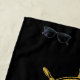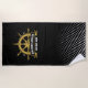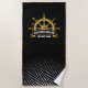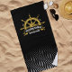 Ein großes, absorbierendes Strandtuch mit klassischem Schiffrad-Design auf schwarzem und goldfarbenem Hintergrund. Personalisieren Sie es mit Ihrem Bootsnamen für ein einzigartiges Strandzubehör. Ideal für sonnige Tage am Strand oder am Pool.