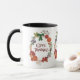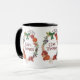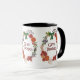 Eine wunderschöne Erntedank-Tasse mit einem Kranz von Herbstfrüchten, Blätter, Samentöpfen und Blume aus einem Aquarelldesign, handbemalt von Judy Adamson. Der Hintergrund ist weiß, aber Sie können diese Erntedank-Tasse anpassen, indem Sie die Hintergrundfarbe ändern, und dieses Design passt zu jeder Tasse.