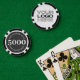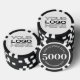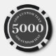 Personalisierte Poker-Spielchips mit eigenem Firmenlogo und eigenem Text. Dieses schwarze Design enthält die Nummer 5000, kann aber mit beliebigem Wertebetrag bearbeitet werden.
