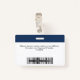 Dieses Abzeichen mit dem Namen des Mitarbeiters kann einfach mit Foto, Bar-Scan und Firmenlogo personalisiert werden. Ein einfaches Business-Design in marineblau-weißer Farbe, das in Vorder- und Rückengrößen vollständig anpassbar ist, serifenlose, einfache und moderne Schriftart und ein berufliches und klares Aussehen. Verfügbar mit oder ohne Lanyard, Metallklammer oder mit Retraktierbar. Keine Mindestbestellung.