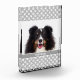Personalisierbare und einfache Vorlage für das Foto eines Tieres auf einer grauen Hintergrundfarbe, die ein Muster von Pfoten mit weißem Hund aufweist. Es gibt auch einen personalisierbaren Textbereich für einen Namen unter dem Foto.